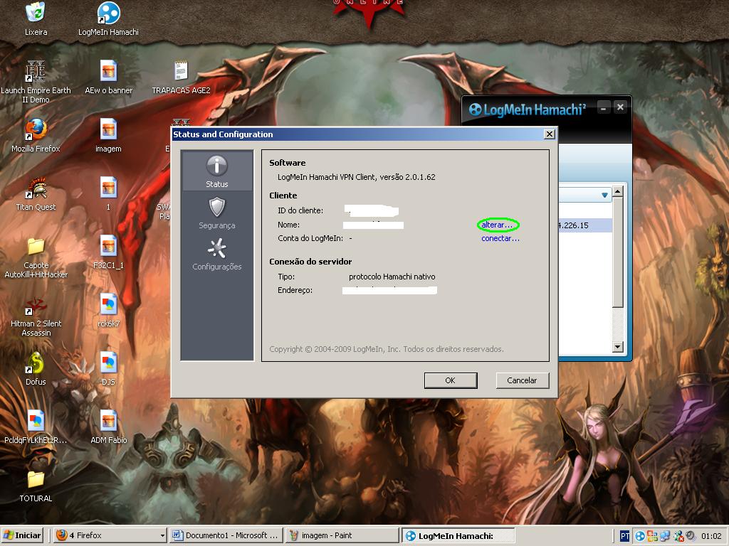 Apos isso click em alterar para alterar seu nome do Hamachi depois click em OK